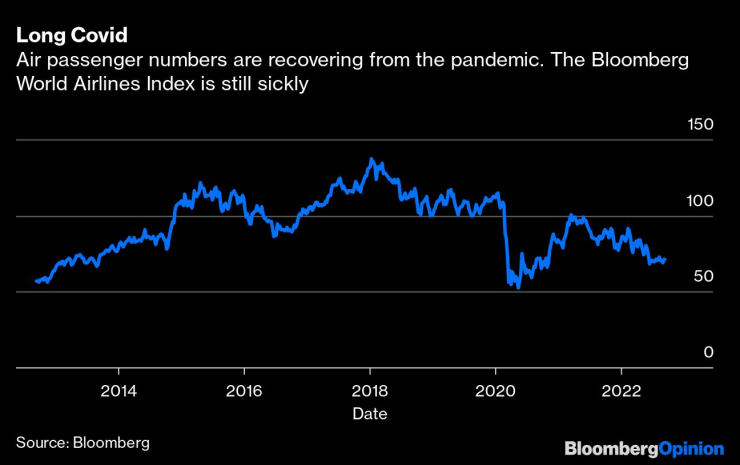 Ако въздушният транспорт оставя Covid зад себе си, акциите на авиокомпаниите изглежда не четат новините. Индексът на Bloomberg World Airlines миналата седмица падна близо до най-ниската си точка от ноември 2020 г. – месец, когато международният трафик се движеше на по-малко от 12% от нивата от предходната година.
