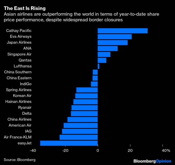 Погледнато по този начин, въпросът, който трябва да зададем за състоянието на цените на акциите на авиокомпаниите, не е защо са толкова слаби, а защо са толкова силни. Най-добре представящите се превозвачи досега тази година са предимно тези, които най-малко могат да се похвалят с нещо - азиатски авиокомпании, които все още са изправени пред масово затваряне на въздушното пространство. Петте най-добри акции са базирани в развита Азия - Cathay Pacific Airways Ltd., Eva Airways Corp., Japan Airlines Co., ANA Holdings Inc. и Singapore Airlines Ltd.
