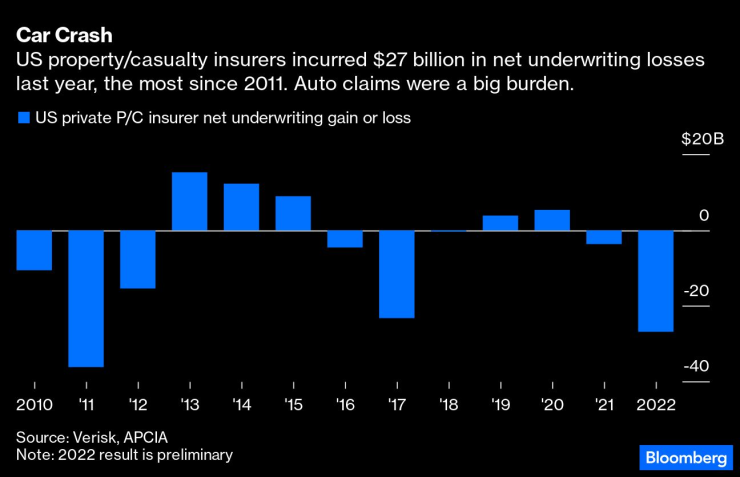 Най-големият автомобилен застраховател в САЩ, State Farm Mutual Automobile Insurance Co., отчете 13,4 млрд. долара загуби от застраховане през миналата година, като това е най-голямата загуба в 100-годишната му история; загубите от застраховане на автомобили на Allstate Corp. възлизат на 3 млрд. долара, а звеното за автомобилно застраховане Geico на Berkshire Hathaway Inc. губи 1,9 млрд. долара.