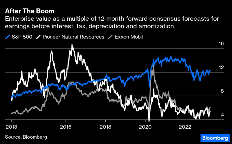 Преди десетилетие книжата на Pioneer се търгуваха при пазарен множител на Ebitda, който беше с около 50% по-висок от този на Exxon (използвах Ebitda вместо печалби поради ефектите от петролния срив през 2014 г. и пандемията). Днес Exxon се търгува с лека премия спрямо Pioneer, но и двете са с отстъпка от около 50% спрямо S&P 500. Случиха се две неща. Първо, икономиката на шистовия бум, при който инвеститори и кредитори финансираха заграбване на земя, което облагодетелстваше главно потребителите чрез ефективно субсидирани цени на енергията, се срина. Второ, тази имплозия, както и нарастващите опасения относно търсенето на петрол, което ще достигне връх по-рано, отколкото никога, свалиха целия енергиен сектор в сравнение с по-широкия пазар.