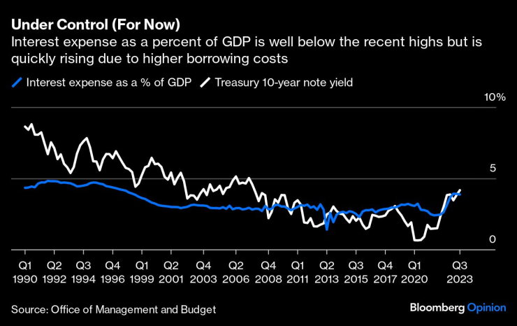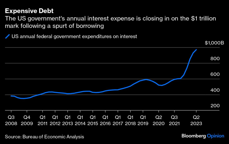 Притеснителното е, че САЩ може да се доближат некомфортно близо до подобен сценарий. Министерството на финансите е напът да похарчи почти 1 трилион долара само за лихвени плащания през фискалната 2023 г., в сравнение с по-малко от 600 милиарда долара преди пандемията и около 425 милиарда долара през 2011 г., когато S&P понижи рейтинга си за САЩ от AAA на AA+.