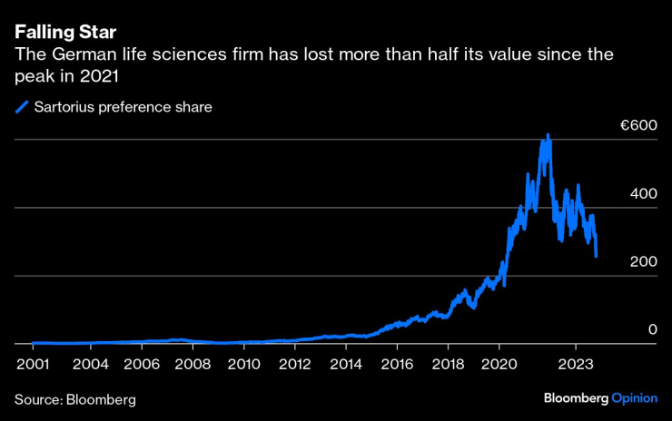 Една от най-добре представящите се европейски акции през този век се сгромоляса обратно на земята с трясък. Проблемите на германската фирма за лабораторно оборудване Sartorius AG капсулират болката, причинена на бизнеса от нарастващите лихвени проценти, изчезването на китайското търсене и нормализирането на продажбите след пандемията. Смятана от инвеститорите за донякъде устойчива на рецесия, Sartorius се оказа тревожно нестабилна.