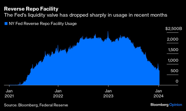 Количеството лесно достъпни държавни ценни книжа има значение за поддържане на достатъчна ликвидност на системата. RRP падна обратно до около 700 милиарда долара, спад от пика от над 2,5 трилиона долара в края на 2022 г., когато Федералният резерв вдигна ограниченията за индивидуално използване на средства и разшири допустимостта. Федералният резерв може да отмени всяка от тези мерки, но няма пълен контрол върху размера на RRP, така че това е балансиращ акт между централната банка и Министерството на финансите. Търсенето на съкровищни бонове може да нарасне над нивото, на което Министерството на финансите се чувства удобно да издава. Ако RRP падне под, да речем, $500 милиарда, тогава Министерството на финансите може да се наложи да увеличи предлагането и при по-дълги падежи; 80% от нетното увеличение на неизплатения дълг през 2023 г. дойде в съкровищни бонове, така че гъвкавостта вече е ограничена.