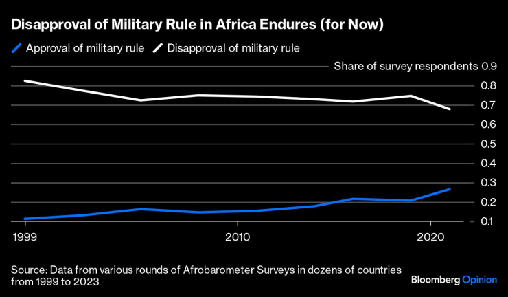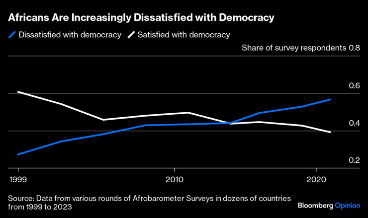 Доказателство за това са както данните за общественото мнение, така и за избирателната активност. От 2015 г. насам мнозинството от африканците, анкетирани в десетки държави, изразяват недоволство от демокрацията. Зловещо е, че в последния кръг от проучвания (2022 г. ) мнозинството също подкрепя военна намеса в политиката, за да се спре политическата дисфункция. Тези две данни рязко контрастират с последователното отхвърляне от страна на респондентите на узаконеното военно управление.