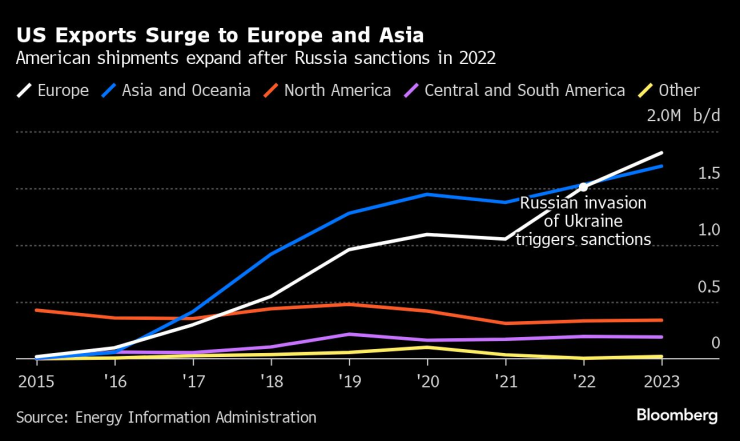 Макар че американският петрол винаги е бил сред най-търсените в световен мащаб, прекъсването на енергийните потоци след нахлуването на Русия в Украйна увеличи привлекателността на американските барели. Доставките за Европа и Азия нараснаха след това, превръщайки САЩ в един от най-големите износители в света.