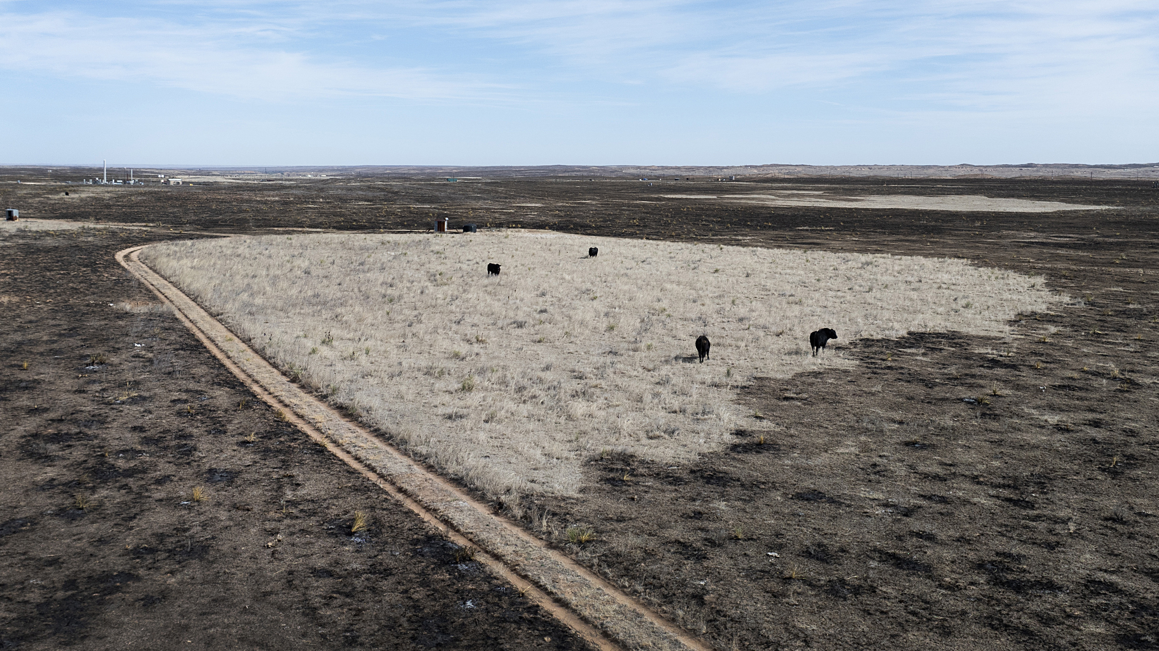 Говеда пасат на остров от неизгоряла трева след пожара в Смоукхаус Крийк близо до Пампа, Тексас, през март. Снимка: Скот Олсън/Getty Images