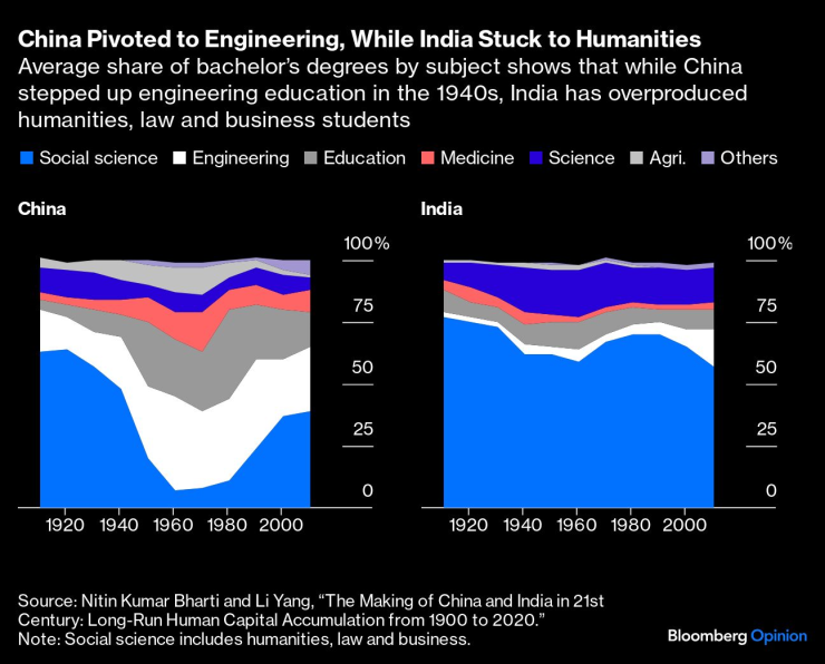 Общоприетото мнение, особено в САЩ, е, че Индия е „страната на инженерите“. Вярно е, че много основатели и изпълнителни директори в технологичната индустрия, включително главните изпълнителни директори на Microsoft Corp. и Alphabet Inc. са родени и образовани в Индия. Но огромното разрастване на мрежата от високоскоростни влакове или усъвършенстването на електрическите превозни средства показва, че Бхарти и Ян може би са попаднали на често пренебрегван източник на конкурентоспособността на Китай. „По-големият дял на завършилите инженерни и професионални специалности в Китай, в съчетание с по-големия дял на завършилите основно и средно образование, се поддава по-лесно на фокусиране върху производството“, казват авторите.