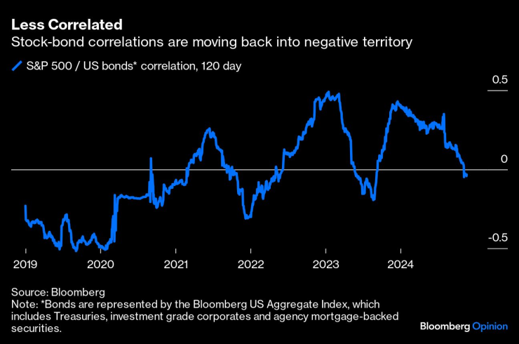 Ако изборите са ви разстроили и разконцентрирали, най-лесното решение може да бъде версия на класическия портфейл от акции и облигации 60/40. Традиционните портфейли от акции и облигации получиха лоша слава след наказателната разпродажба на двата класа активи през 2022 г., но това бяха много различни времена. Тогава облигациите предлагаха много малък доход за смекчаване на удара и по същество се движеха в крачка с акциите. Днес корелациите между акции и облигации отново стават отрицателни.
