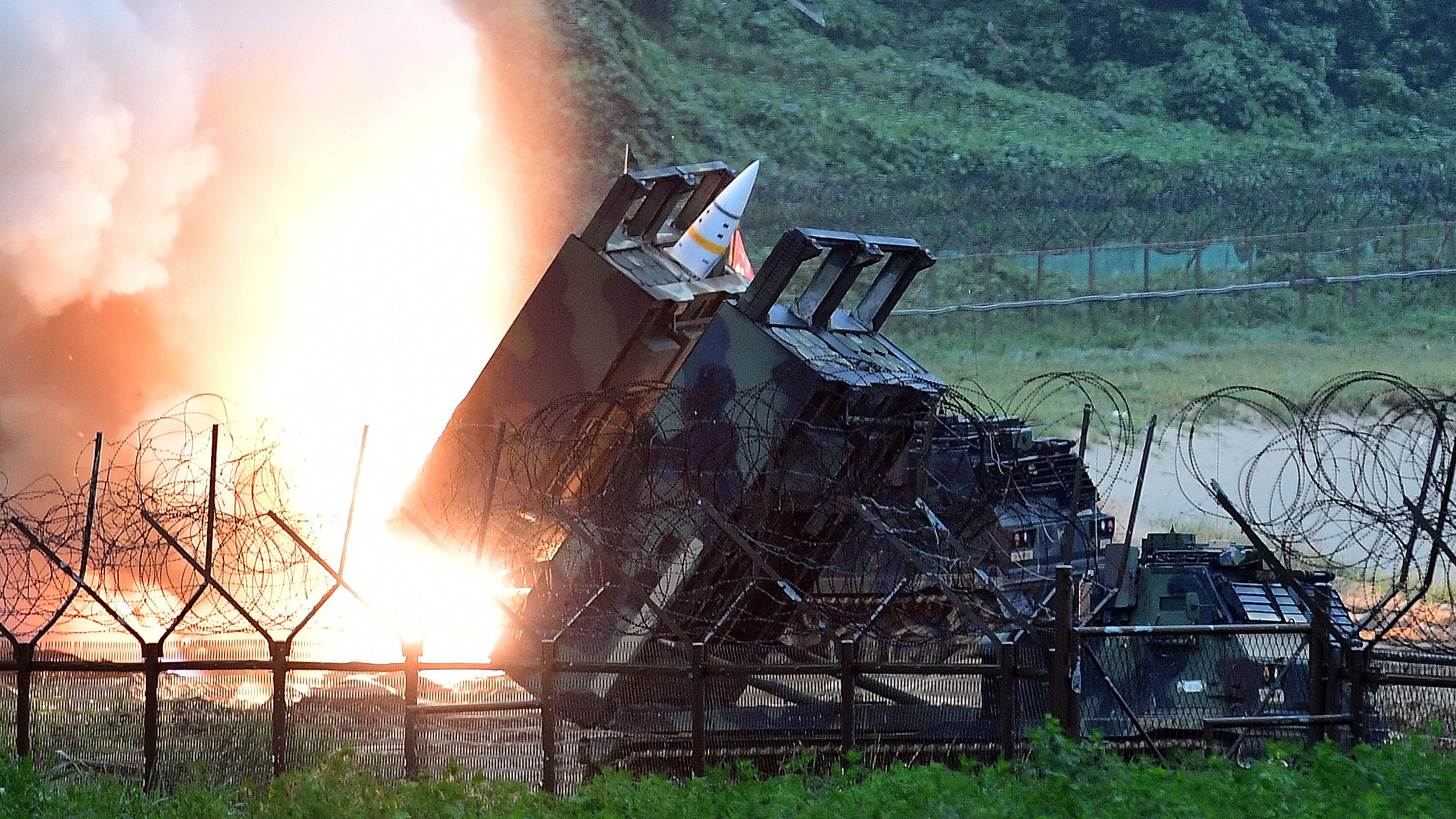 На тази снимка, предоставена от южнокорейското министерство на отбраната, тактическа ракетна система на американската армия стреля в Източното море по време на съвместни ракетни учения на Южна Корея и САЩ в Южна Корея през 2017 г.