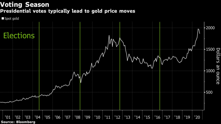 Президентските избори обичайно водят до промени в цените на златото. Графика: Bloomberg