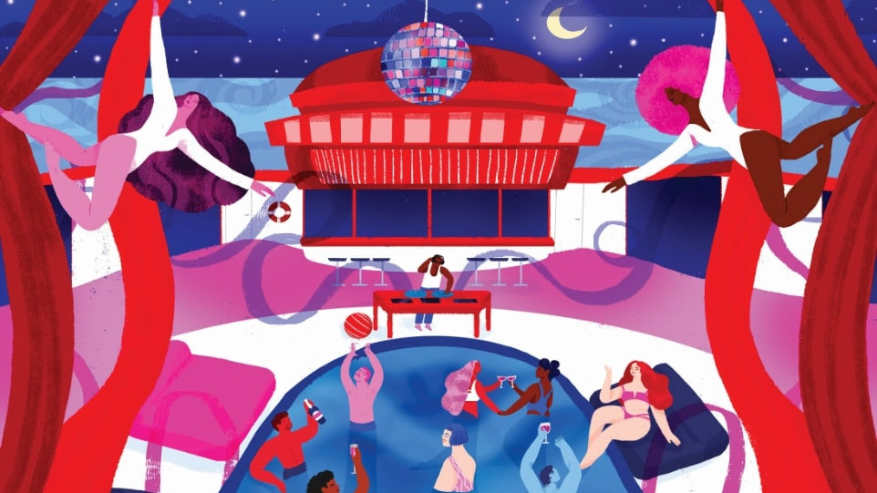 Насред премигващи светлини, бумтяща хаус музика и въртящи се танцьорки, на празника на морската богиня, провеждащ се на “Алената лейди“ (Scarlet Lady) с 2,770 пътника, самотната майка Кайли Стори се почувства толкова освободена, че скочи в басейна. Дори не се поспря, за да махне дългата си пурпурна рокля и крилата на пеперуда. Стори, на 32, и нейна приятелка резервирали кабина в първия кораб Върджин Войаджес на Ричард Брансън, който започна с пътешествията само за възрастни през октомври, след 18 месеца забавяне. „Това е да живееш живота от малко по-дивата му страна“, казва тя, подгизнала, някъде между Маями и Насау.