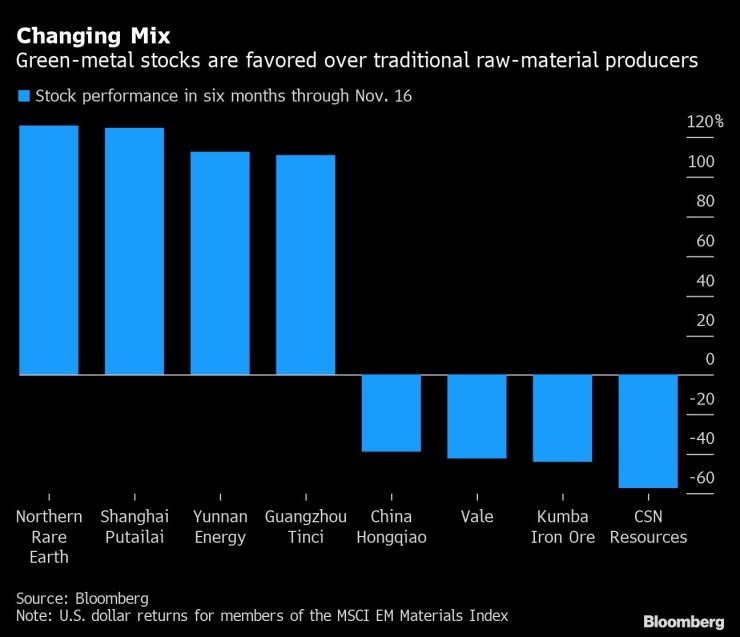Индексът MSCI за нововъзникващите пазари, който включва компании като Vale SA и Tata Steel Ltd., се срина до 18-месечно дъно спрямо суровинния индекс на Bloomberg, тъй като неговия ръст не успя да стимулира производителите на желязна руда и стомана. Въпреки че тези компании изпитат трудности, тези, които насочват вниманието си върху компонентите на литиево-йонни батерии, органичен силиконов каучук и редки метали, които се използват за устойчиви технологии са отбелязали трицифрен ръст за последните шест месеца. Въпреки отчасти че различията се дължат на мерките на Китай върху емисиите и енергоемките отрасли, той е емблематичен за прехода на капиталовите пазари към зелените акции. Това вече се случва в САЩ и Европа, водено от залози за Tesla Inc. Финансовите мениджъри казват, че в развиващите се пазари вече има наваксване, където стоките играят по-голяма роля в насочването на привличането за инвеститорите.