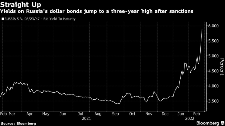 Облигациите в местна валута на страната са загубили около 14% през тази година, което е най-лошото представяне на развиващите се пазари, според индексите на Bloomberg. Доходността на руските доларови облигации с падеж 2047 г. се повиши за пети ден в сряда до 5,9%, което е най-високата стойност за последните три години.