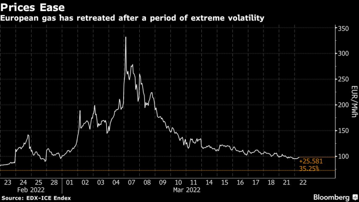 Референтните фючърси се търгуваха в диапазона от близо 100 евро за мегаватчас през последните дни, отстъпвайки от рекордно високите нива след инвазията на Русия в Украйна миналия месец. На Русия се падат около 40% от доставките на газ в Европейския съюз и около една трета от тези пратки преминават транзитно през Украйна.