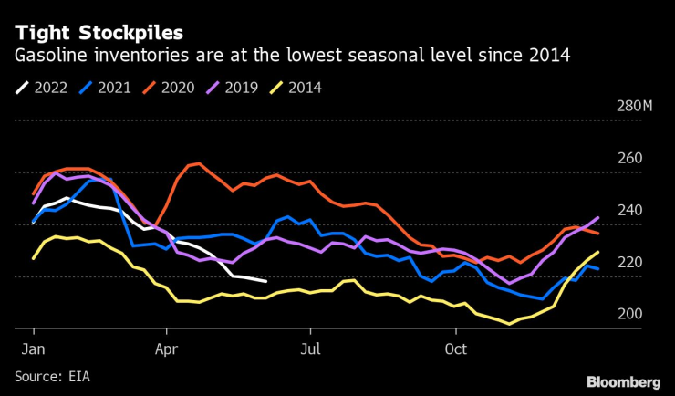 „Запасите от бензин са в по-голяма степен в съответствие с нивата, които обикновено виждаме в края на сезона на шофиране и очевидно все още имаме цялото лято пред нас“, каза Уорън Патерсън, ръководител на стратегията за стоки в ING Groep NV. „Очакваме, че пазарът на рафинирани продукти ще се засили още повече през следващите месеци, което ще бъде възходящо за цените на суровия суров.”