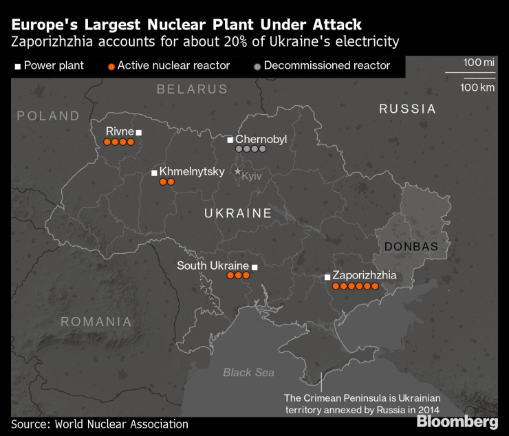 Руските сили превзеха централата, скоро след като започнаха нахлуването си в Украйна на 24 февруари и тя е близо до фронтовите линии. Русия и Украйна си размениха обвинения за изстрелване на снаряди, които са застрашили централата.