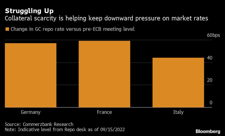 Разходите за заемане на парични средства срещу германски държавни облигации на репо пазари, където дилъри и фондове търсят краткосрочно финансиране, са се повишили само с 57 базисни пункта след решението на ЕЦБ да повиши лихвите със 75 базисни пункта миналата седмица, според данни на Commerzbank AG.