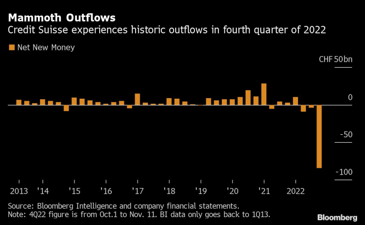 Кредиторът каза, че към 11 ноември нетните изходящи потоци на активи са били около 6% от активите под управление в края на третото тримесечие. Това се равнява на приблизително 84 милиарда швейцарски франка в изходящи потоци от звеното за управление на богатство и активи.