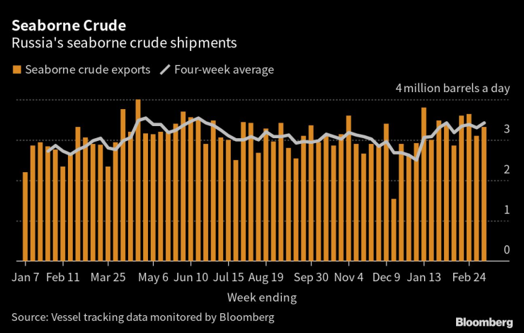 В отговор на западните санкции Русия обеща да намали производството си на петрол с 500 000 барела на ден през март. Засега, според данните за проследяване на кораби на Bloomberg, няма признаци за засегнати експортни потоци. Дебитът на руските рафинерии през първите дни на март спадна с 2% спрямо нивата от февруари, но съкращенията може да са отчасти ефект от сезонната поддръжка.