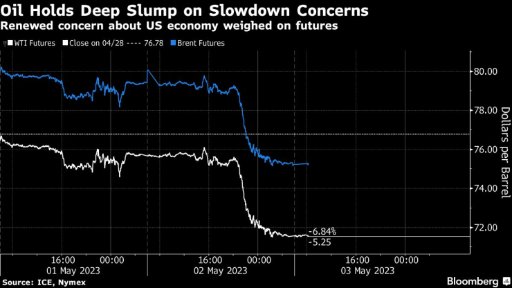 Brent се задържа над 75 долара за барел, след като затвори на най-ниското ниво от повече от пет седмици. Суровият петрол се понижи заедно с други суровини, тъй като данните показаха охлаждане на пазара на труда в САЩ преди това, което се очаква да бъде последното увеличение на лихвените проценти от Федералния резерв в настоящия цикъл на затягане. Подновената загриженост за банковия сектор в САЩ добави натиск за продажби.