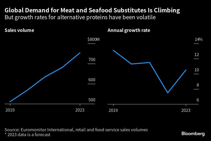 ADM очаква пазарът на алтернативни протеини да нараства годишно с „високи едноцифрени цифри“ и да достигне 100 милиарда долара продажби до 2030 г. Euromonitor International, която проследява продажбите в търговски обекти и хранителни услуги, прогнозира глобален обем на продажбите на заместители на месо и морски дарове да расте повече от 10% тази година.
