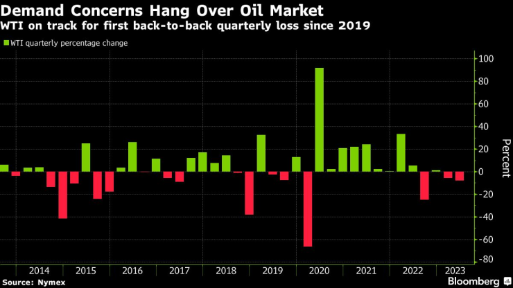 Бенчмаркът на САЩ все още е напът за първото си последователно тримесечно понижение от 2019 г. насам, тъй като слабото икономическо възстановяване на Китай и агресивното затягане на паричната политика от страна на Федералния резерв натежаха върху цените. Предлагането също е изобилно, подкрепено от устойчивия износ от Русия въпреки санкциите.