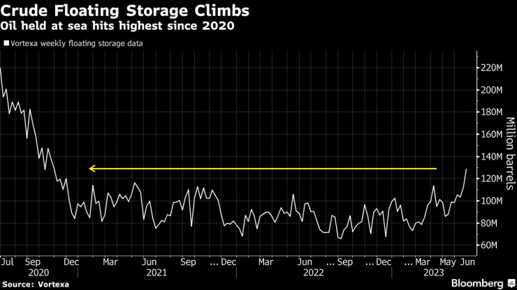 Около 129 милиона барела суров петрол са били неподвижни на петролни танкери през седмицата до 23 юни, според данни на Vortexa. Това е най-много от октомври 2020 г. Обемите за съхранение в Азия достигнаха 11-месечен връх миналата седмица, докато тези в Близкия изток бяха най-високите от януари.