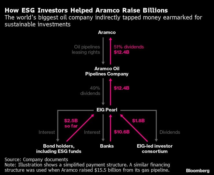 Saudi Aramco, най-голямата петролна компания в света, се превърна в малко вероятен бенефициент на средства, предназначени за устойчиви инвестиции, благодарение на сложна мрежа от финансови структури, които използва, за да набира пари от своите тръбопроводи.