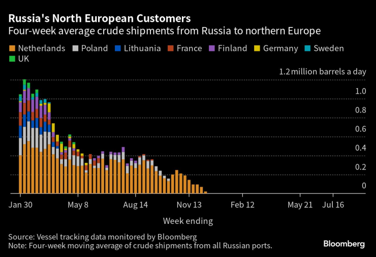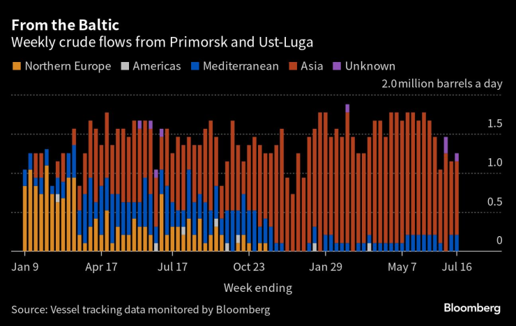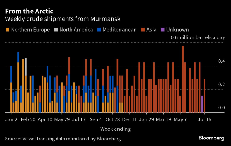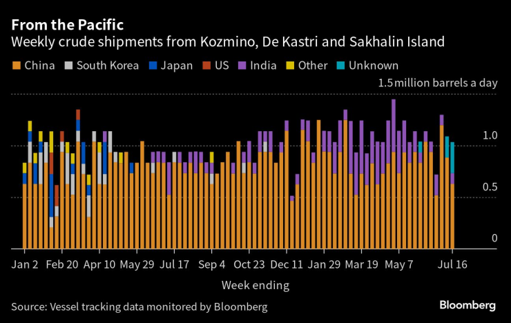 Тъй като в Европа останаха малко купувачи, въздействието на по-ниските потоци се усеща в доставките за Азия, които паднаха до най-ниското си ниво от средата на януари. По-малките обеми подкопаха приходите на Кремъл от експортни такси, които паднаха до най-ниското си ниво от април през последния четириседмичен период.