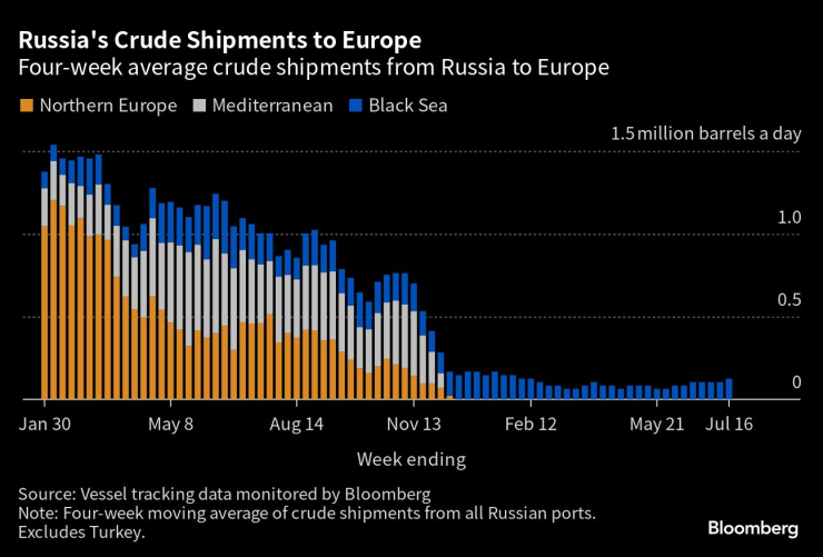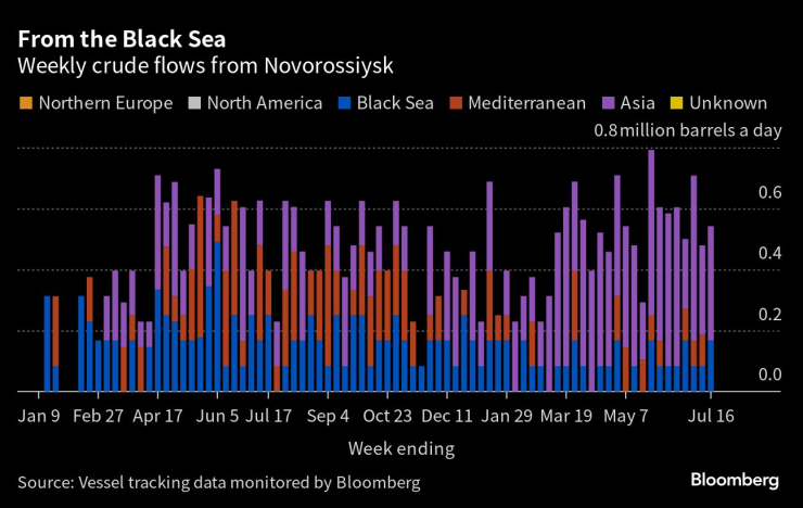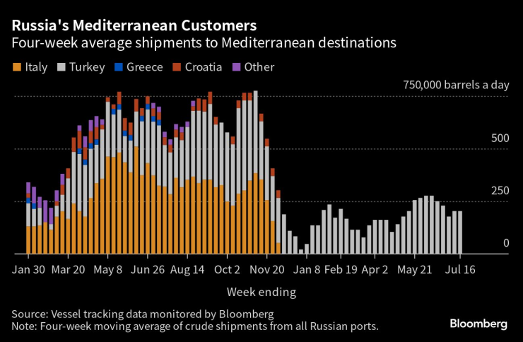 Износът за Турция, единственият останал средиземноморски клиент на Русия, остана непроменен на 203 000 барела на ден през четирите седмици до 16 юли. Потоците към страната надхвърлиха 425 000 барела на ден през октомври.