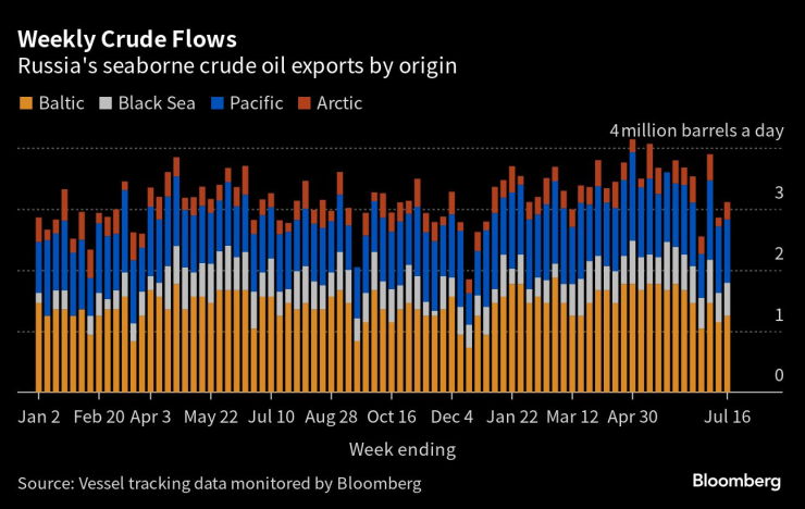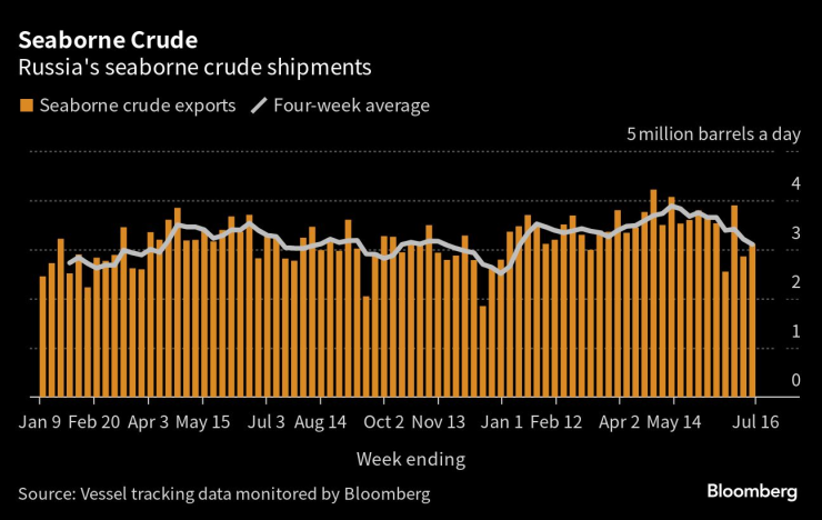 Доставките на суров петрол през четирите седмици до 16 юли са спаднали до 3,1 милиона барела на ден, според данни от проследяване на кораби, наблюдавани от Bloomberg и потвърдени от други източници на данни. Това е спад със 780 000 барела на ден от пика им през 28-те дни до 14 май. Доставките бяха с 270 000 барела на ден под нивото през февруари, базовият месец, когато руското правителство обяви намаляване на добива, което трябваше да влезе в сила през март.