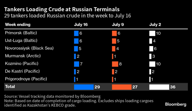 Общо 29 танкера са натоварили 21,78 милиона барела руски суров петрол през седмицата до 16 юли, показват данните от проследяването на корабите и докладите на пристанищните агенти. Това е увеличение с 1,78 милиона барела спрямо цифрата от предходната седмица, но по-малко от около 3 милиона барела спрямо средните седмични доставки, наблюдавани тази година до средата на юни. Дестинациите се основават на това къде корабите сигнализират, че се насочват към момента на писане, и някои дестинации почти сигурно ще се променят с напредването на пътуванията. Всички цифри изключват товари, идентифицирани като казахстански клас KEBCO.