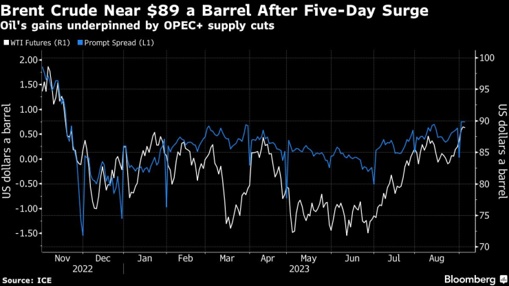 „Трите кръга на съкращения на производството от Саудитска Арабия и нейните партньори от ОПЕК+ от септември 2022 г. напълно обясняват връщането към големия дефицит“, казаха анализатори на Goldman Sachs Group Inc. в бележка, оценявайки недостига на 2,3 милиона барела на ден това тримесечие. „Връщането към дефицитите от своя страна до голяма степен обяснява лятното рали във времевите разлики и цените на петрола.“