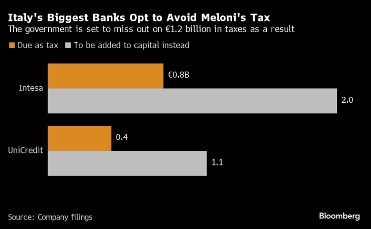 Intesa Sanpaolo SpA последва съперника UniCredit SpA в обявяването, че вместо да плаща наскоро приетия данък, ще избере да запази по-висока сума вътрешно като капиталова възглавница. Тези два хода означават, че повече от 1,2 милиарда евро данъци няма да бъдат прибрани от Рим. Трети кредитор, Mediobanca SpA, каза в четвъртък, че също ще се възползва от тази възможност.