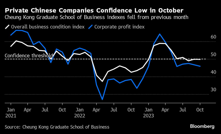 Освен това индексът на бизнес условията в частния сектор от CKGSB в Пекин се понижи леко през октомври спрямо предходния месец и остана под прага, показващ доверие. Проучването обхваща частни компании, които като цяло са сравнително успешни в своите сектори.