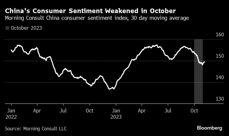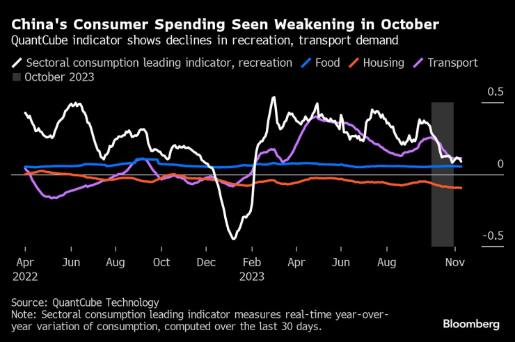 Индикатор за търсенето на китайски потребители за отдих и транспорт, публикуван от базираната в Париж QuantCube Technology, заедно с независимо проучване на потребителските настроения от американската компания Morning Consult, спаднаха през октомври спрямо предходния месец. Проучване на настроенията на частния бизнес от Cheung Kong Graduate School of Business също отбеляза спад през месеца.