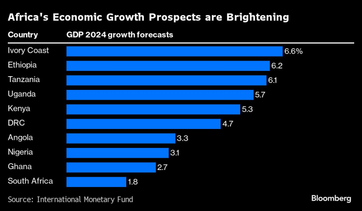 „Перспективите за растеж в Субсахарска Африка се подобряват“, казва икономистът на Bloomberg за Африка Ивон Мханго. „Осем от десетте най-големи икономики в региона, които заедно формират още 40% от регионалния БВП, ще нараснат средно с 5%.“