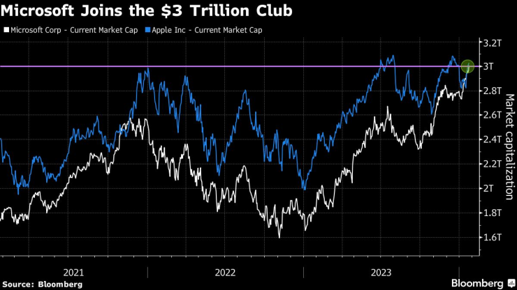 Microsoft Corp. за кратко постигна историческа пазарна оценка от $3 трилиона в сряда, в последния пример за това как оптимизмът за изкуствения интелект е подхранвал привидно неудържим ръст в софтуерния гигант.