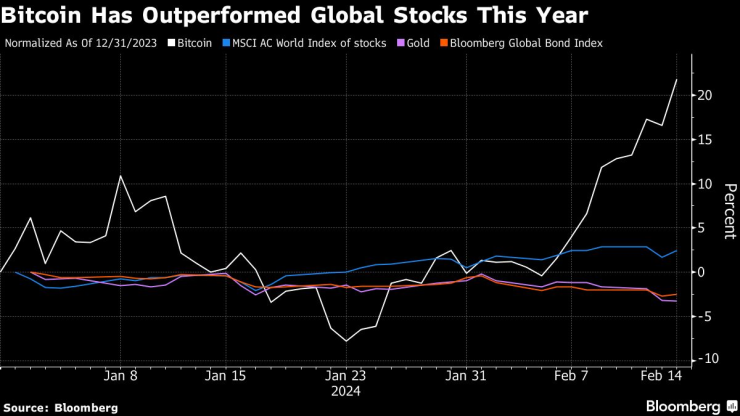 Специфични за сектора фактори подкрепят биткойн, включително дебюта на американски борсово търгувани фондове, посветени на токена. Партидата от продукти на компании като BlackRock Inc. и Fidelity Investments привлече нетно 3,9 млрд. долара от началото на търговията им на 11 януари. Междувременно т.нар. "халвинг" на биткойн, която трябва да се осъществи през април, ще ограничи предлагането на най-големия цифров актив - събитие, което мнозина разглеждат като опора за цените въз основа на историческия прецедент.