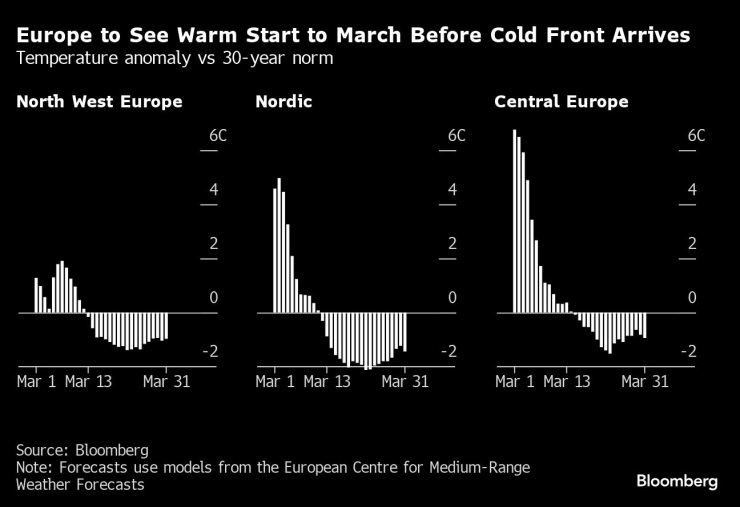 Междувременно по-голямата част от Европа се очаква да види продължаване на мекото време в началото на март, което помага да се запазят ниски цените на енергията. От Обединеното кралство до Франция и Германия най-големите пазари в региона ще бъдат по-топли от обичайното през първите две седмици на месеца, според метеоролози, анкетирани от Bloomberg.