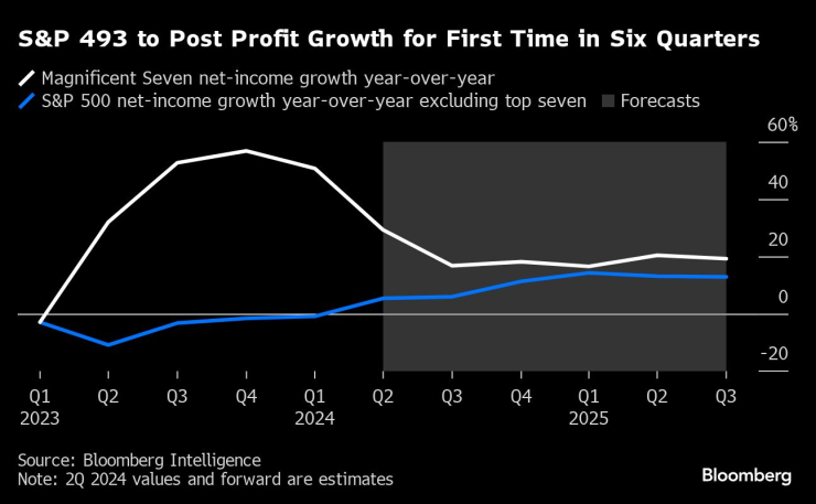 За първи път от 2022 г. инвеститорите вероятно ще насочат вниманието си към останалите 493 компании в S&P 500. Компаниите извън технологиите се очаква да отчетат първото си тримесечно увеличение на печалбите след поне шест тримесечия. Печалбите се очаква да нараснат с 5,4% и се очаква да се ускорят към двуцифрено увеличение до последните три месеца на годината, според данни, събрани от BI.