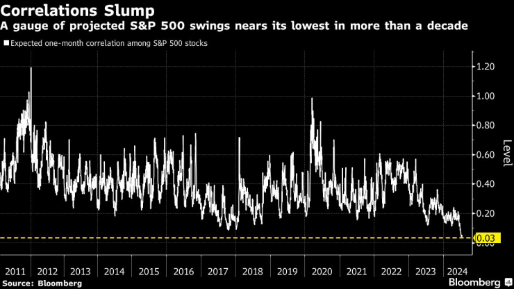 Търговците залагат, че цените на акциите няма да се движат в унисон през този сезон на отчетите, което затруднява избора на победители. Докато инфлацията намалява, различните перспективи за индустриите на S&P 500 оставиха показател на очакваната едномесечна корелация в акциите на индекса да се движат на най-ниското си ниво от повече от десетилетие, показват данните, събрани от Bloomberg. Отчитане на 1 означава, че ценните книжа ще се движат в синхрон - в момента е 0,03.