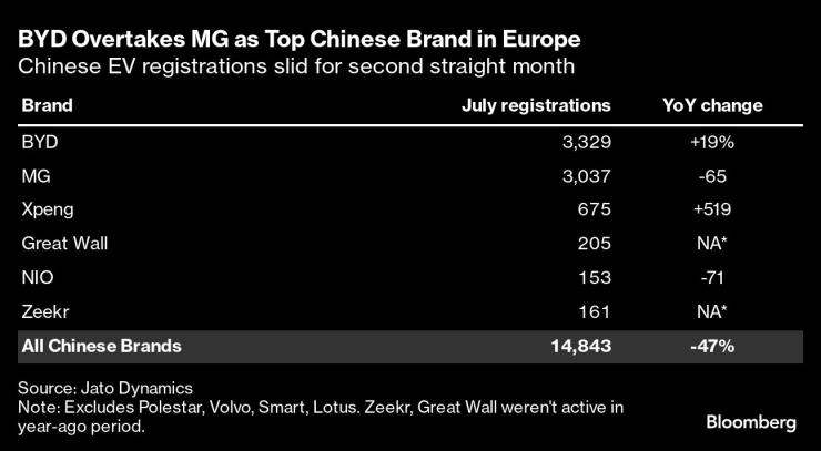 Спадът от 48% доведе до втори пореден месец на намаляване на дела на китайските марки, въз основа на данни, предоставени от изследователя Dataforce. MG, британската компания, която сега е част от SAIC Motor Corp., загуби първото си място в Европа от китайския си конкурент BYD Co., според Jato Dynamics, която също следи автомобилния пазар.