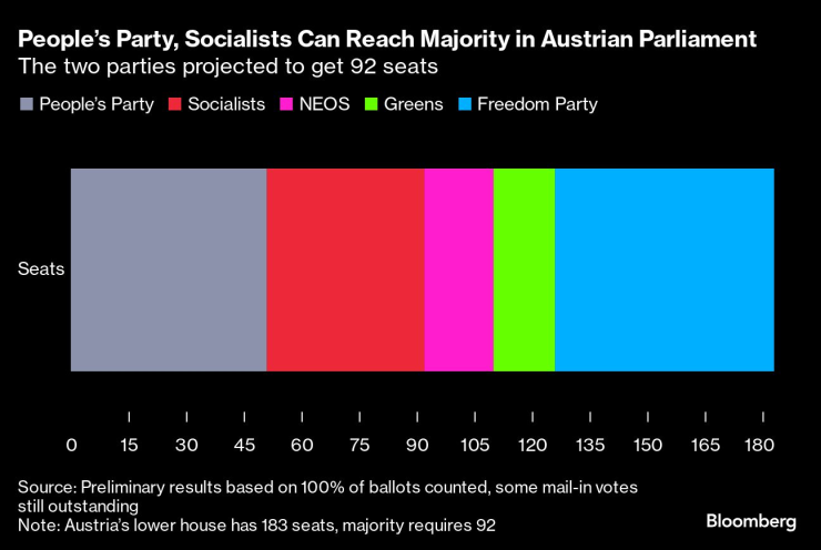Народната партия и социалистите могат да постигнат мнозинство в австрийския парламент. Двете партии ще получат 92 места