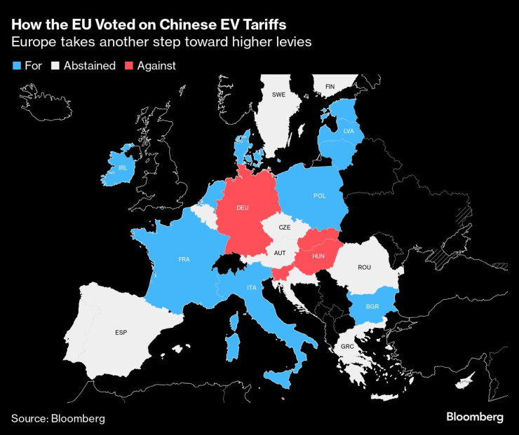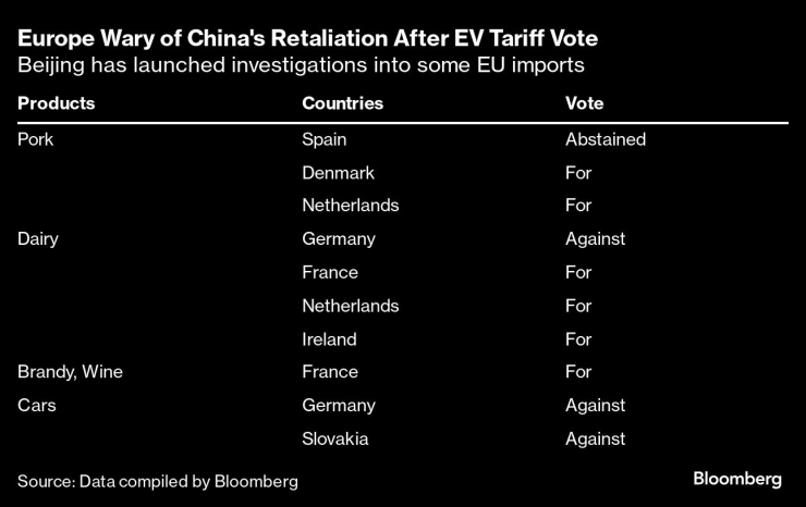 Докато разговорите продължават, решаващи улики може да се крият в гласуванията на отделните държави-членки на ЕС за мерките за електромобилите миналата седмица. Преди това Пекин заплаши с мита вноса на бренди от ЕС и започна разследвания за свинското месо и млечните продукти в отговор на митата - предлагайки редица варианти, които засягат различни части на Европа.