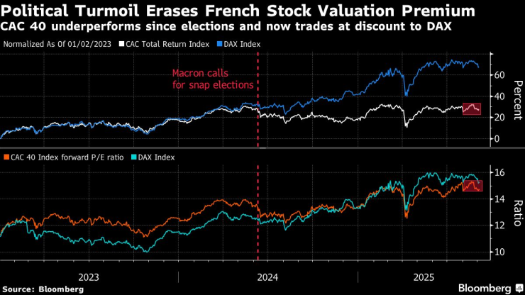 За да се получи някаква представа какво може да донесе бъдещето, е достатъчно само да се погледне близкото минало. Откакто Макрон шокира Франция, като свика предсрочни избори през юни 2024 г., създавайки настоящата патова ситуация, CAC 40 падна с 4,1%, в сравнение с 4,9% ръст за индекса Stoxx Europe 600 и 24% ръст на германския индекс DAX без дивиденти.