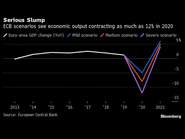 Очакванията са БВП на региона да се свие с между 8 и 12%, посочи Лагард, като изтъкна, че прогнозите за по-лек спад “вече не са актуални”. Коментарът на гуверньора на ЕЦБ подчерта суровостта на кризата за Европа - много компании трябваше да спрат дейността си в разгара на коронавирусната пандемия, а това коства загубата на стотици хиляди работни места и временното освобождаване на още милиони служители.