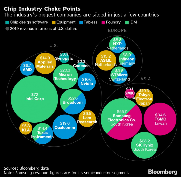 Най-големите компании в бранша са разположени само в няколко държави. Графика: Bloomberg