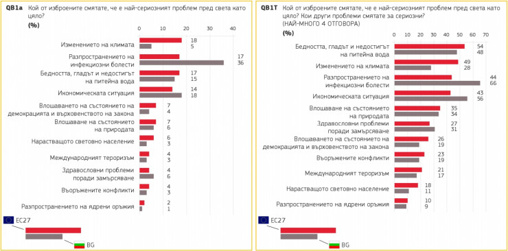 5% в България, доста под средната стойност за ЕС от 18%, вярват, че изменението на климата е единственият най-сериозен проблем. Изменението на климата е на шесто място в България и делът на респондентите, които го споменават, е най-ниският от всички държави-членки на ЕС, както беше