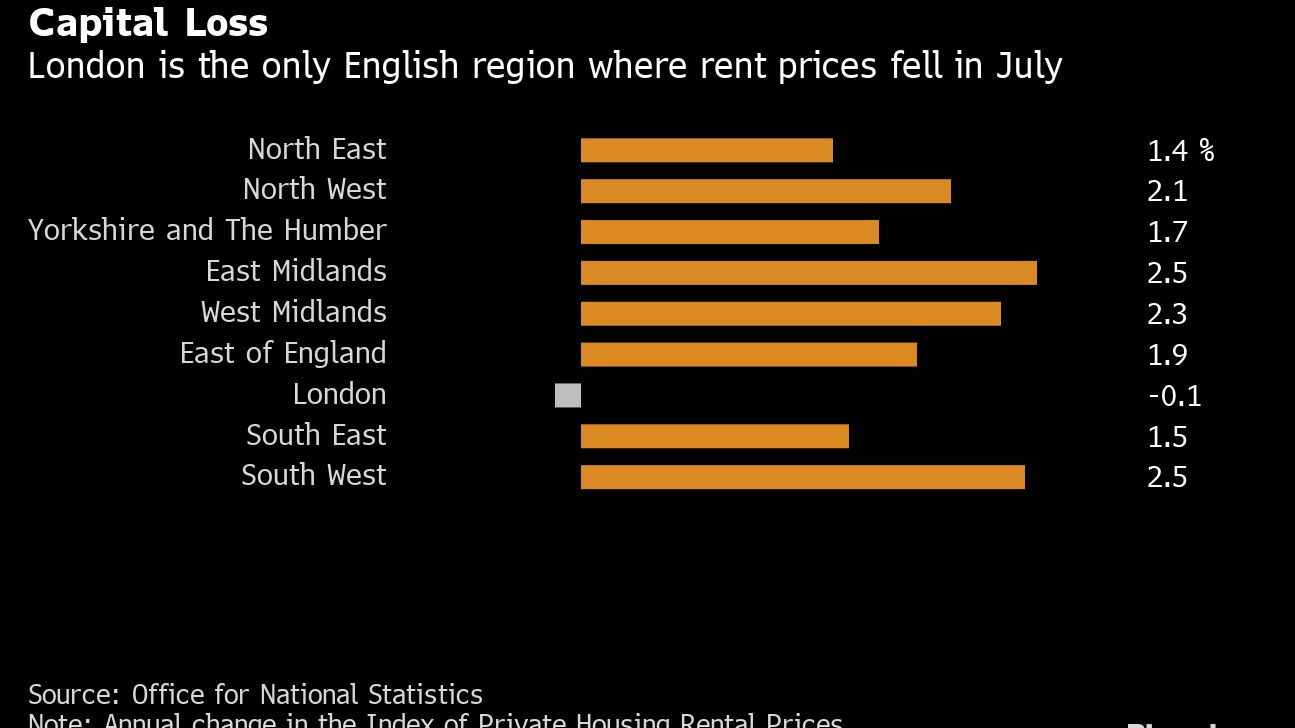 Спадът от 0,1% открои столицата на Обединеното Кралство сред другите региони, където цените на наемите са се покачили средно с почти 2%, показват данни на Службата за национална статистика. Лондон също така регистрира най-бавния темп на нарастване на цените на жилищата по време на пандемията.